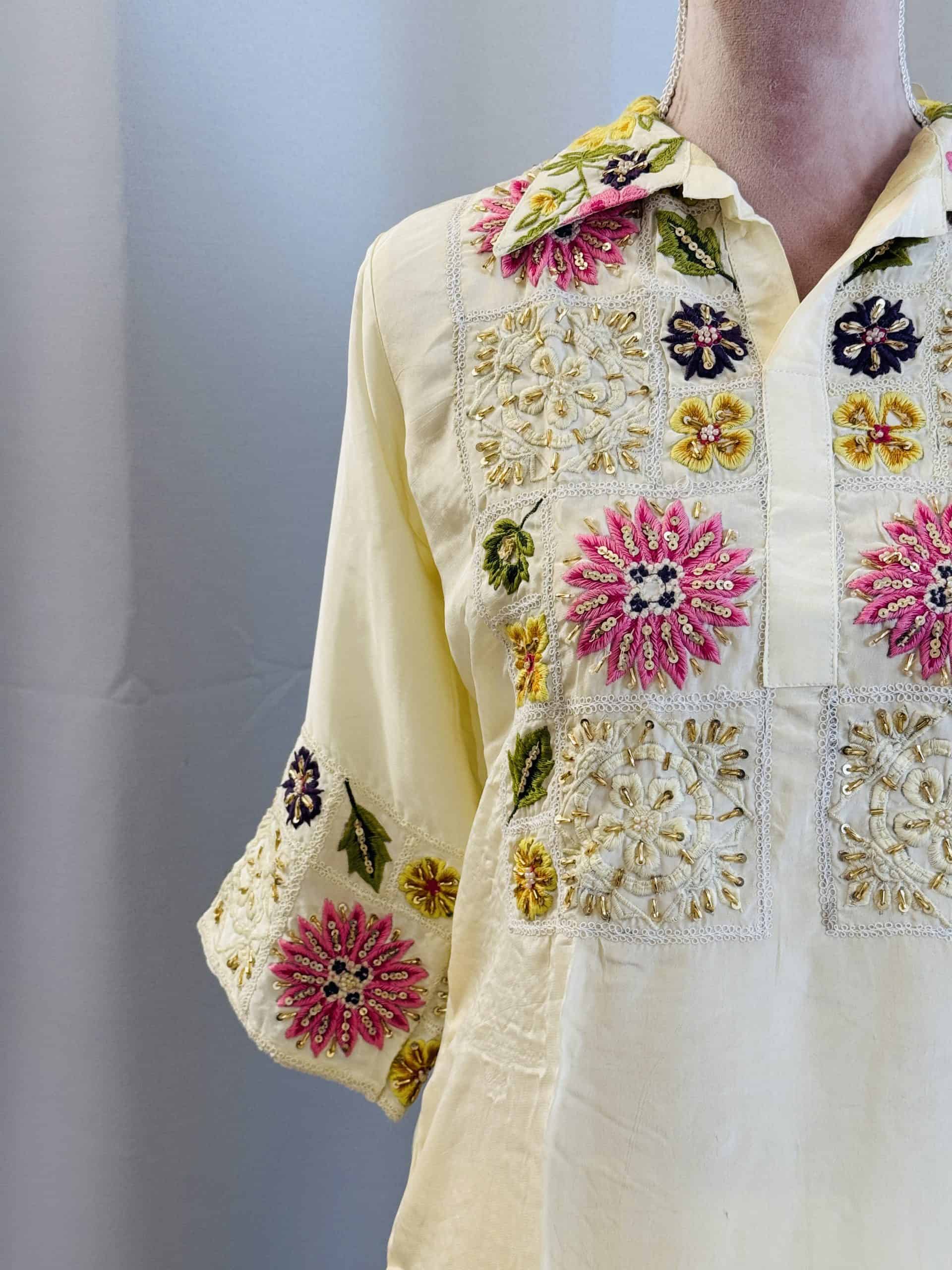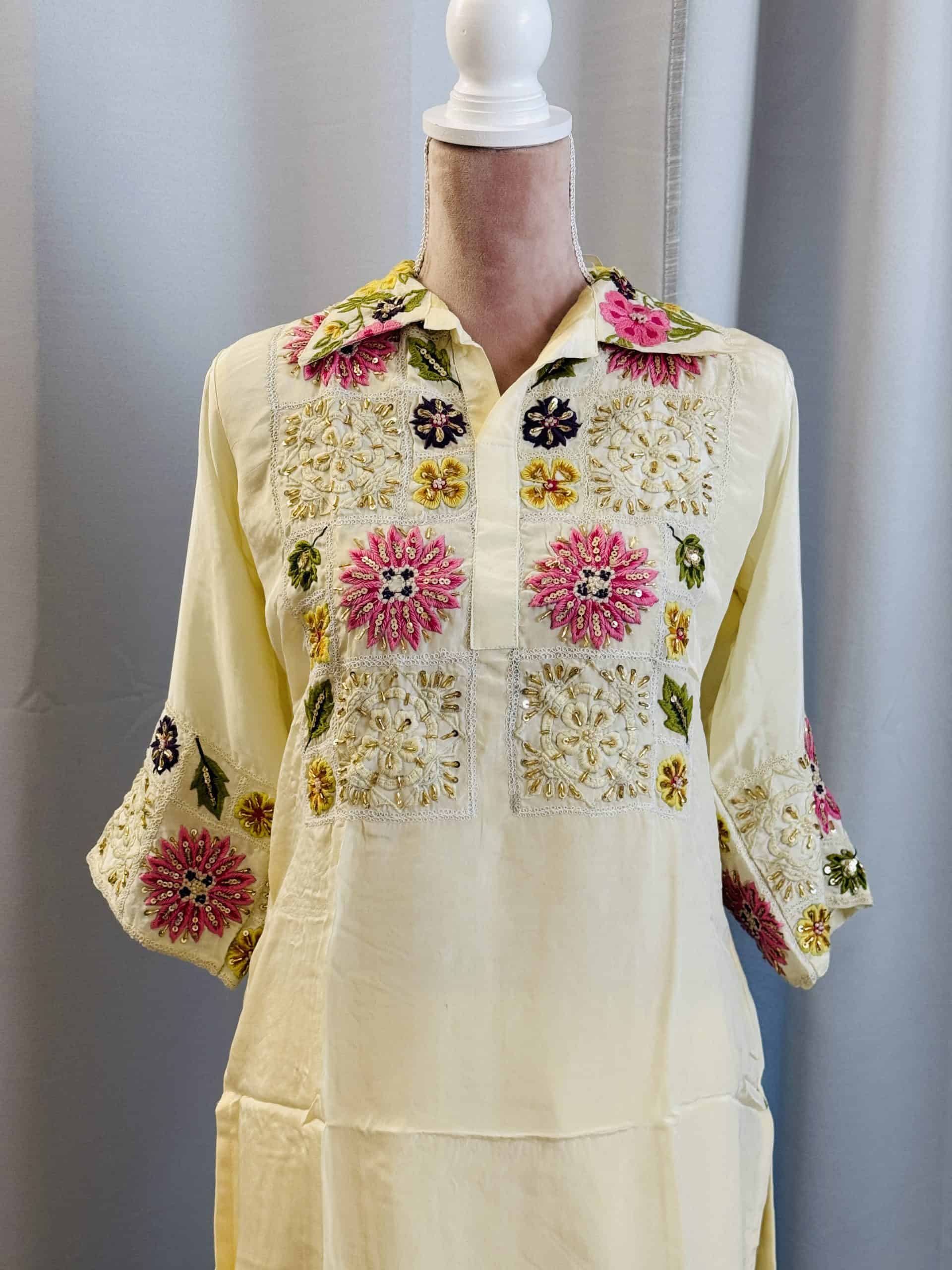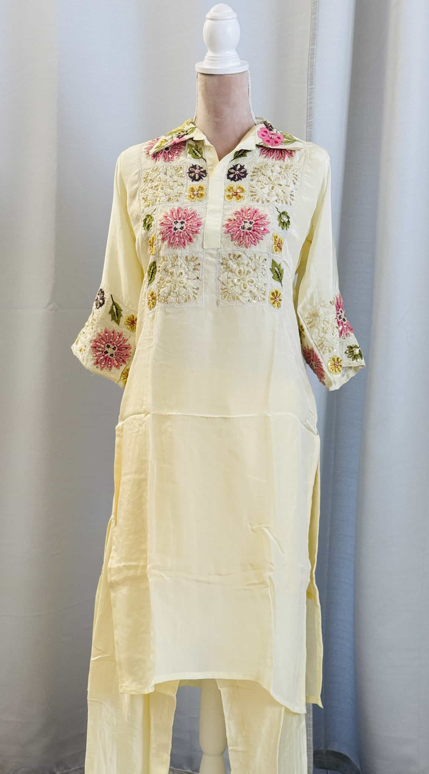 Silk Cream color cord set with Hand Embroidery in the Yoke part, neck and sleeves.